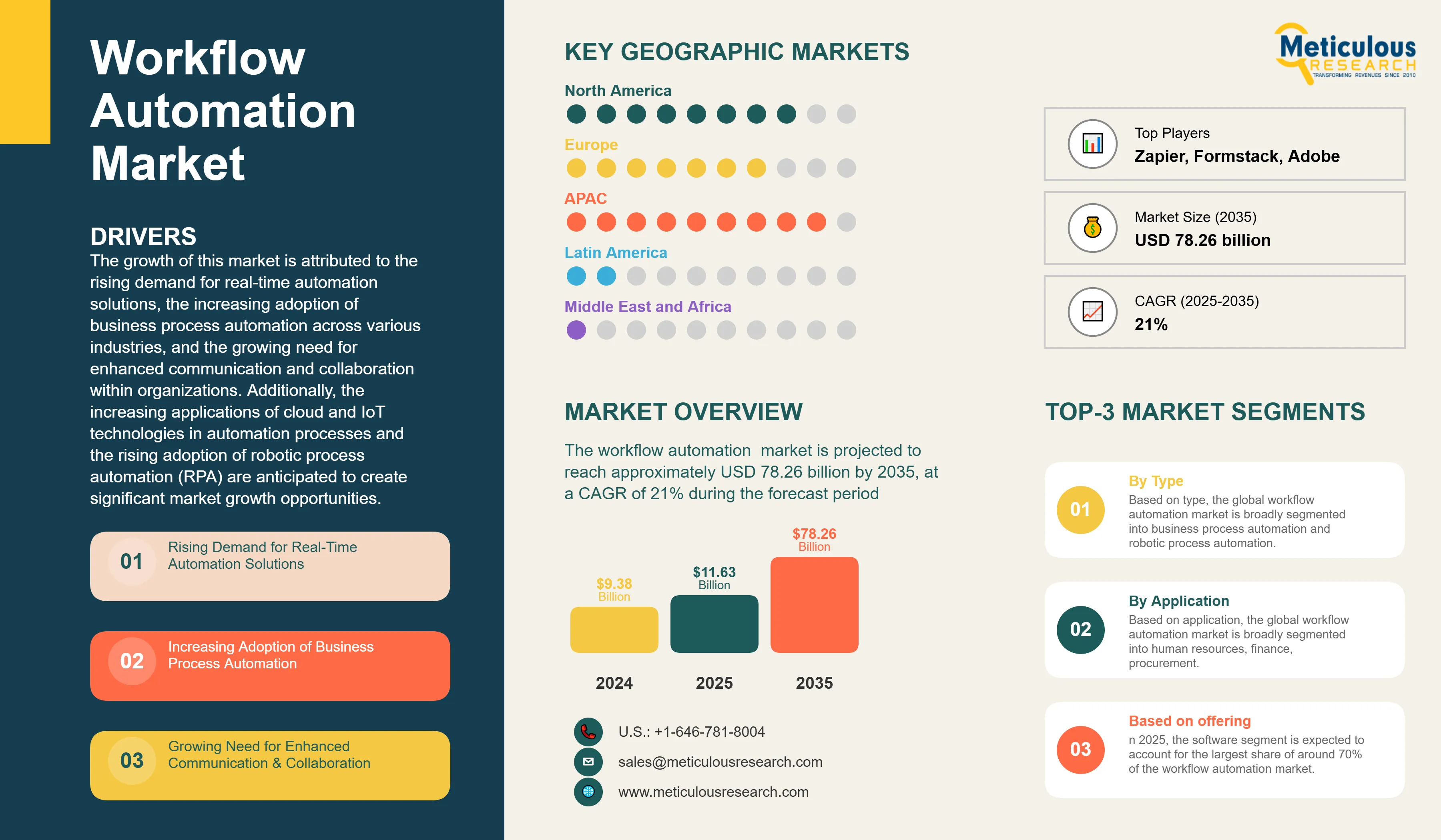 The workflow automation market is projected to reach $78.3 billion by 2035, at a CAGR of 21.0% during the forecast period.